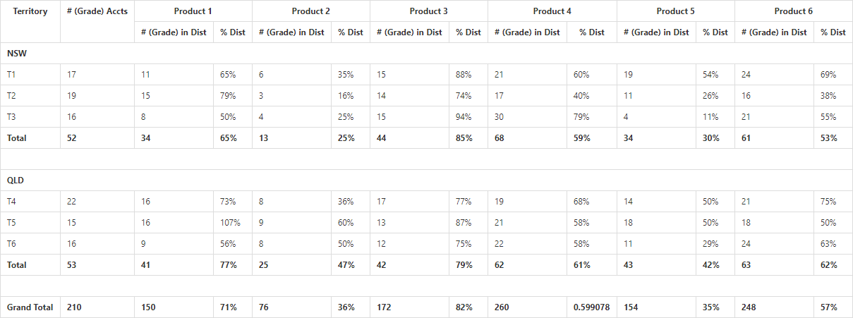 - For example, if "Account X" has had "Dist" ticked on for 5 products in "Brand Z", this counts as a 1 in this column. - % Dist