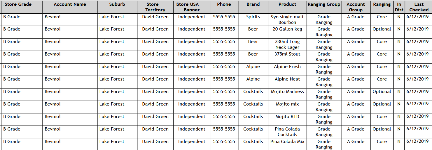 This report details the distribution status of a selected product/product groups vs ranging groups the products are in at the account level. The intention of this report is to allow users to identify which products are marked as "Core" in a Ranging Group are/are not ranged by their accounts.
