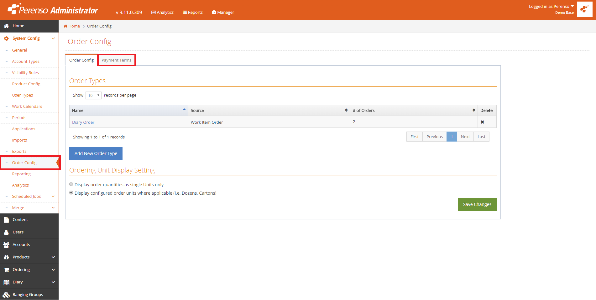 - Log into Perenso Administrator and navigate to System Config > Order Config > Payment Terms.