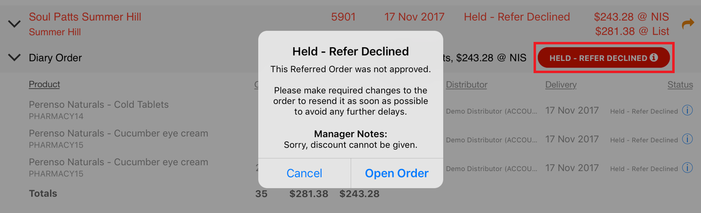 - Held – Refer Declined. Referred order has been declined by head office and order will not be sent until deal is modified.