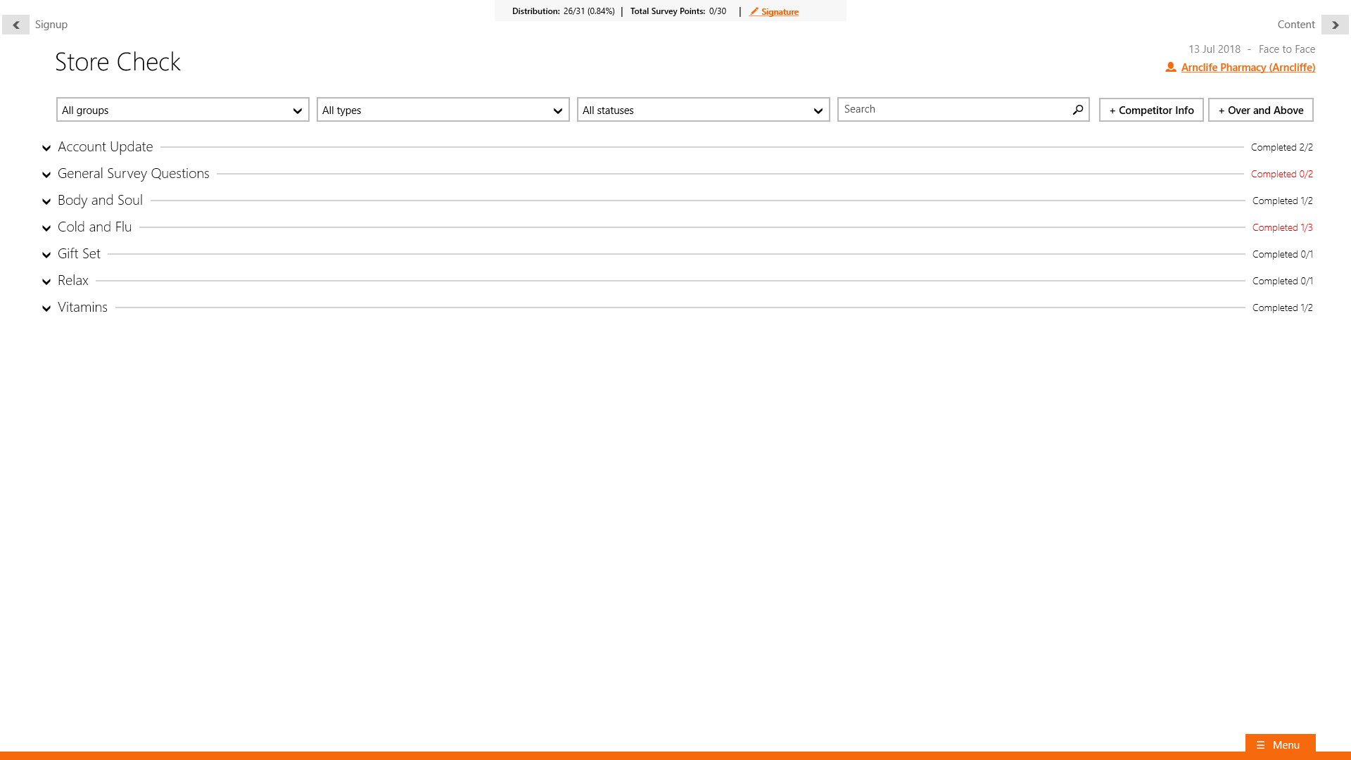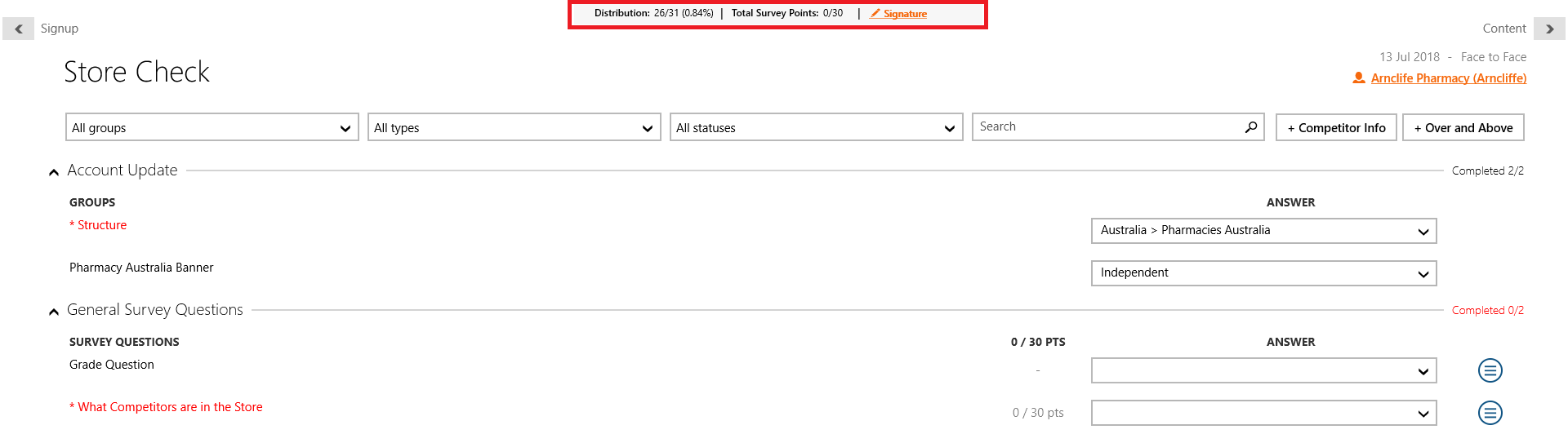 The Store Check work item has a Store Check top bar that shows the distribution percentage, survey points and signature when required.