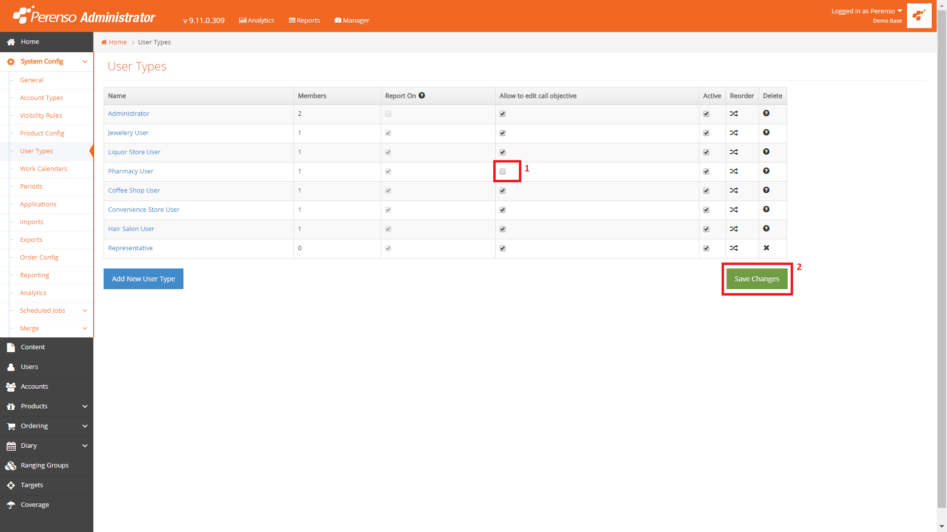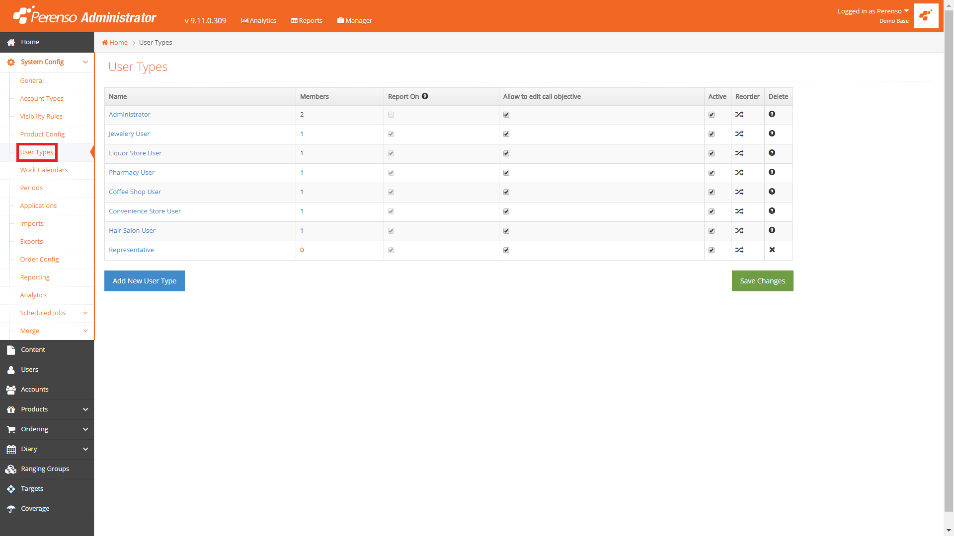 - Log into Perenso Administrator and click on System Config > Users Types.