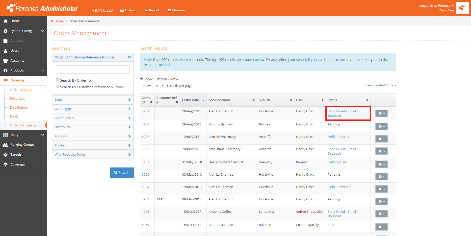 In the Order Management page in both Web Administrator and Web Admin, orders with the status of 'Send Failed - Emailed Bounced' and 'Send Failed - Email Dropped' are now seen as hyperlinks.