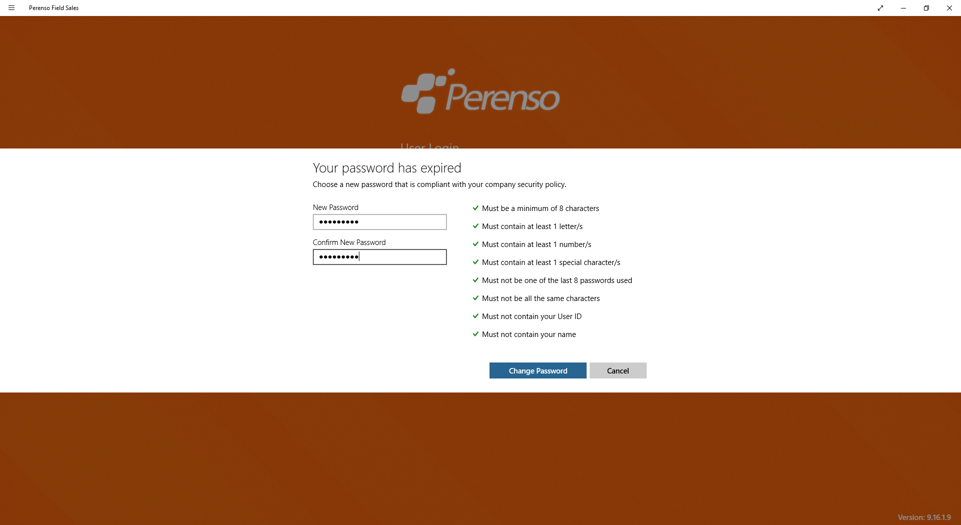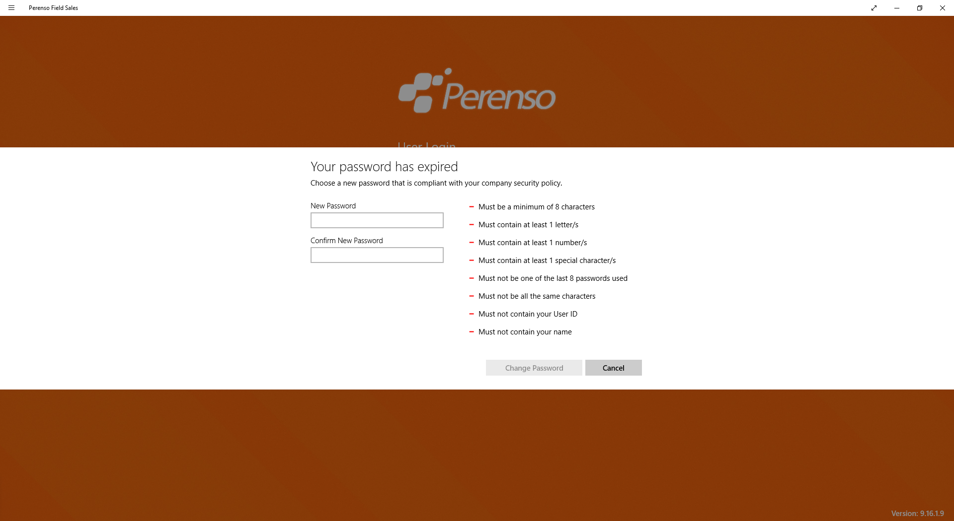 If the 'Password must be change every X days' rule has been enabled by the Perenso Administrator, you must update your password to login to the app once it has expired.
