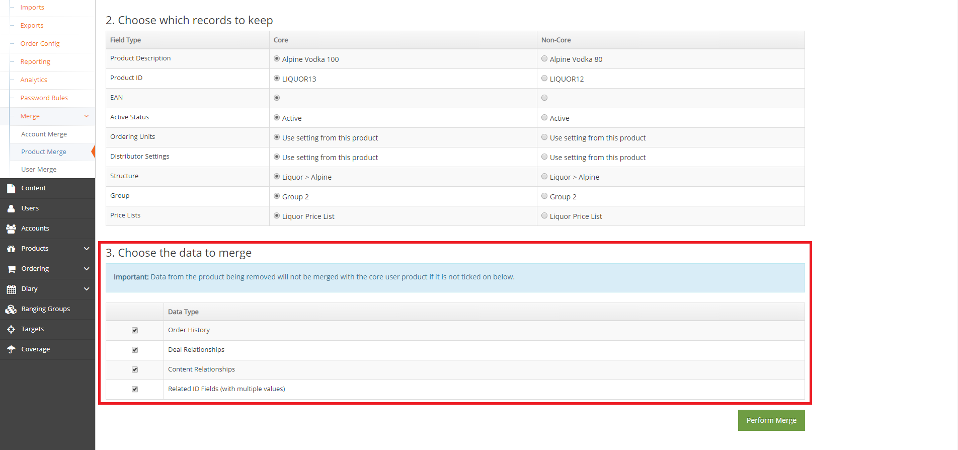 NOTE: All unselected data will be deleted. - Once you are happy with the details, click on Perform Merge to merge the Products.