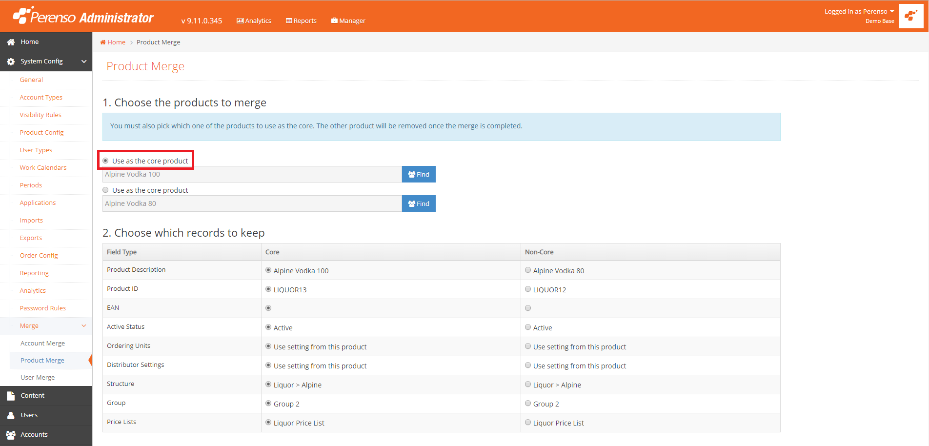 - Log into Web Administrator and navigate to System Config > Merge > Product Merge.