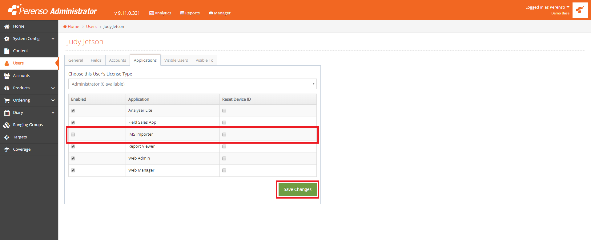 The License Types 'Administrator', 'Administrator + Analytics' have been updated to view the new 'IMS Importer' application.