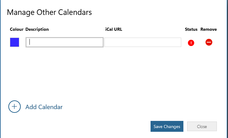 Here you can add a description to the Calendar, change the colour of the events. Once you paste the iCal URL into the field, the status should change to green tick, this means it has succssfully sync the chosen calendar into UWP.